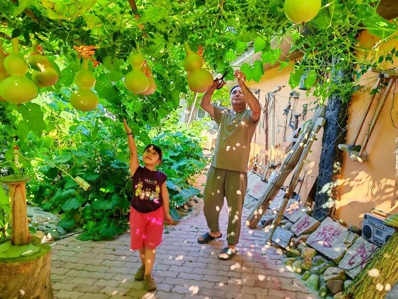 新疆塔城额敏县榆柳巷居民伊力亚尔·伊力在自家小院修剪葫芦藤。