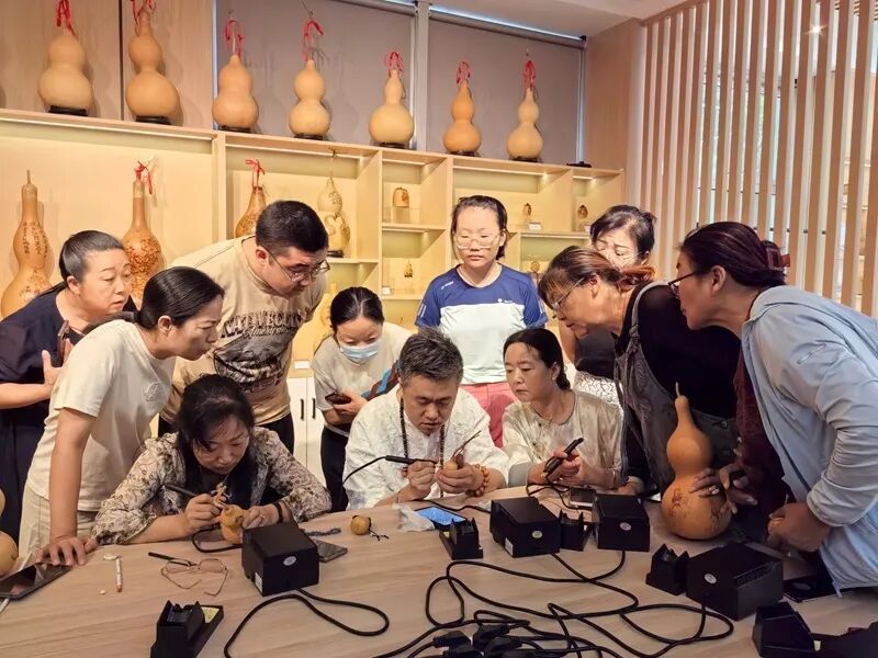 短短一上午,就有二十多位葫芦烙画爱好者报名加入,大家围坐在院中长条桌旁,听着非遗代表性传承人讲述葫芦烙画的千年故事,手里摩挲着尚未完工的葫芦坯子,空气中弥漫着木屑与炭火交织的独特香气。