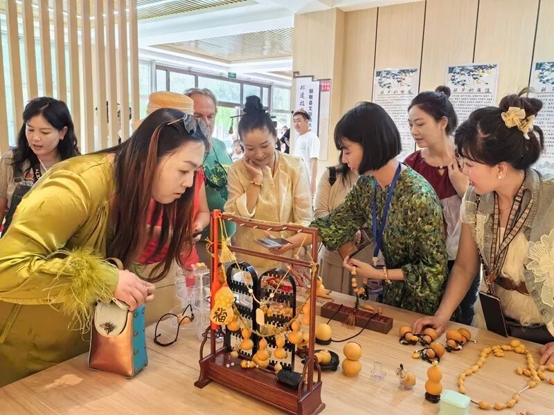 中外游客在额新疆塔城敏县榆柳巷选购葫芦烙画文创产品。