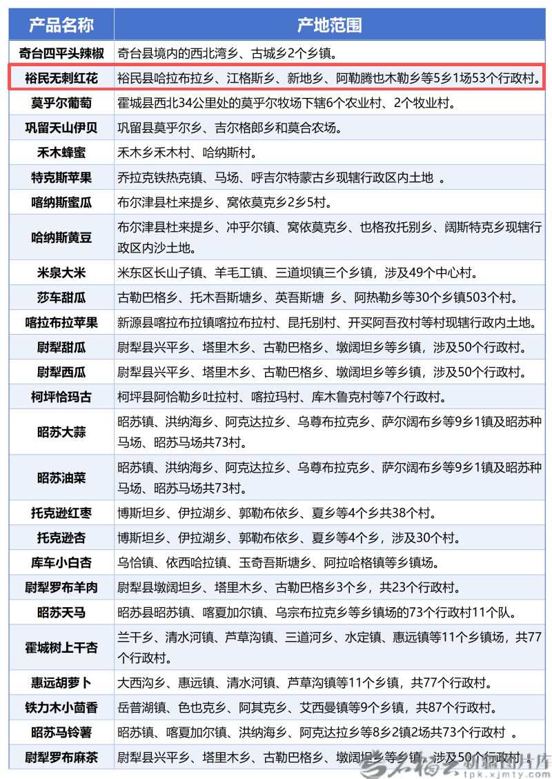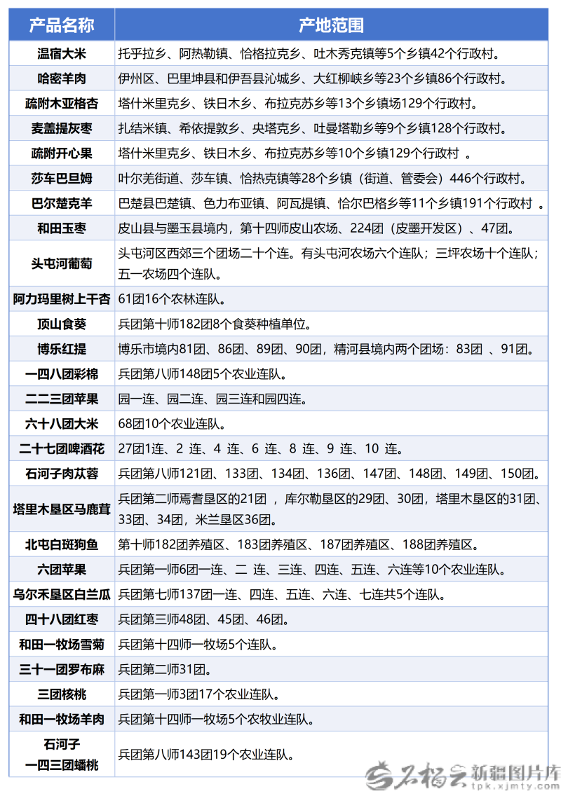 名单显示,入选的包括米泉大米、柯坪恰玛古、昭苏油菜、库车小白杏、昭苏天马、尉犁罗布麻茶、莎车巴旦姆、北屯白斑狗鱼、石河子一四三团蟠桃、下野地西瓜等等很多大家熟悉的产品。