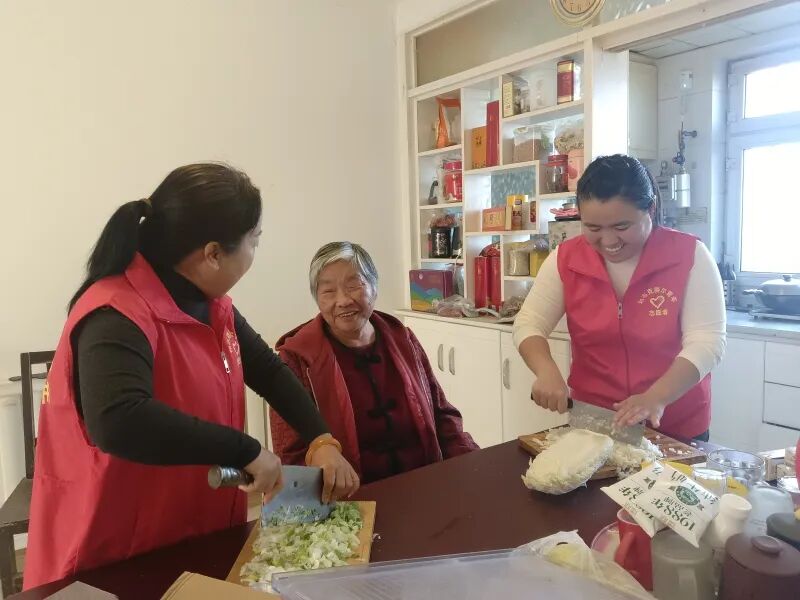 活动中,社工与志愿者分工协作,一组手持抹布、扫帚,擦拭桌面窗台积灰、清扫地面、归置散落物品;另一组走进厨房,帮老人整理橱柜食材、择菜清洗,还挽袖帮其剁饺子馅,全程陪李奶奶拉家常,倾听她的生活趣事,询问身体状况与需求,叮嘱秋冬保暖及用电用火安全。