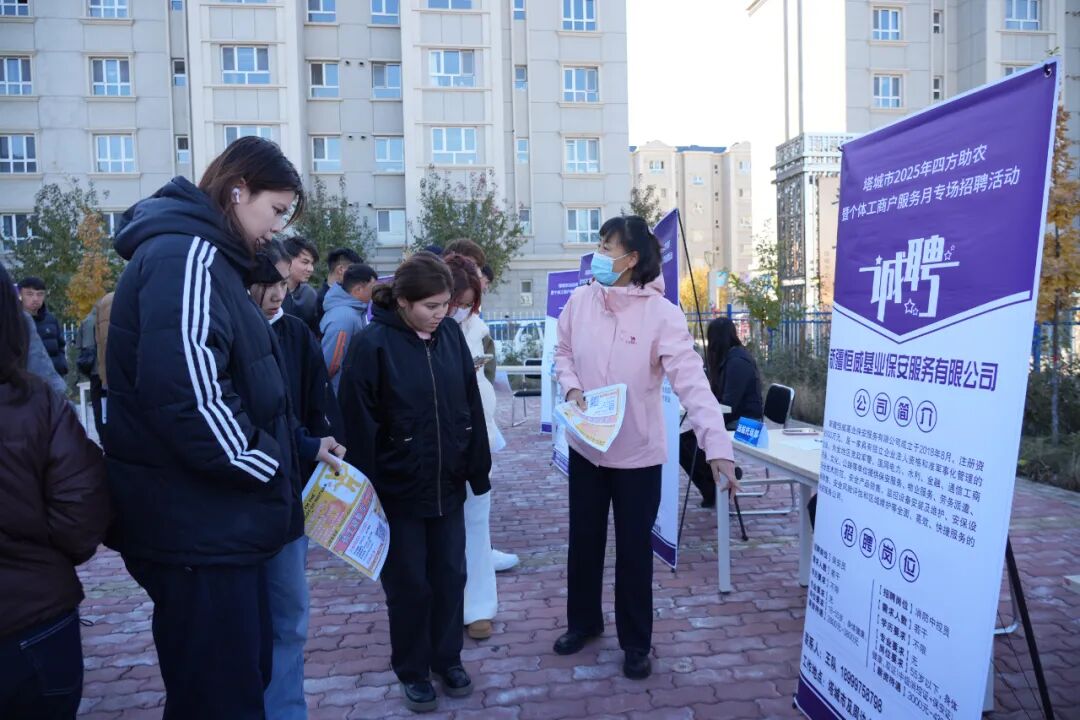10月16日,以“携手四方 共筑农‘职’新未来”为主题的塔城市2025年四方助农暨个体工商户服务月专场招聘活动,在塔城市也门勒乡下三工村火热开展。
