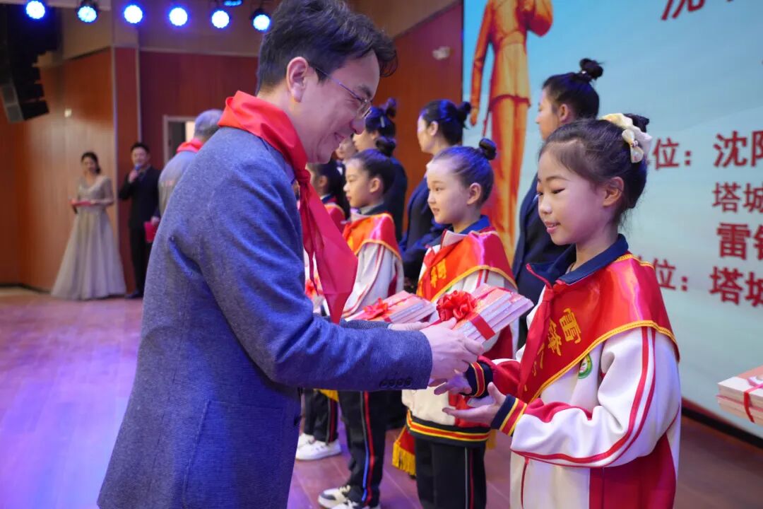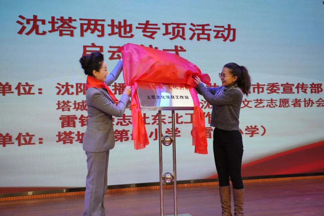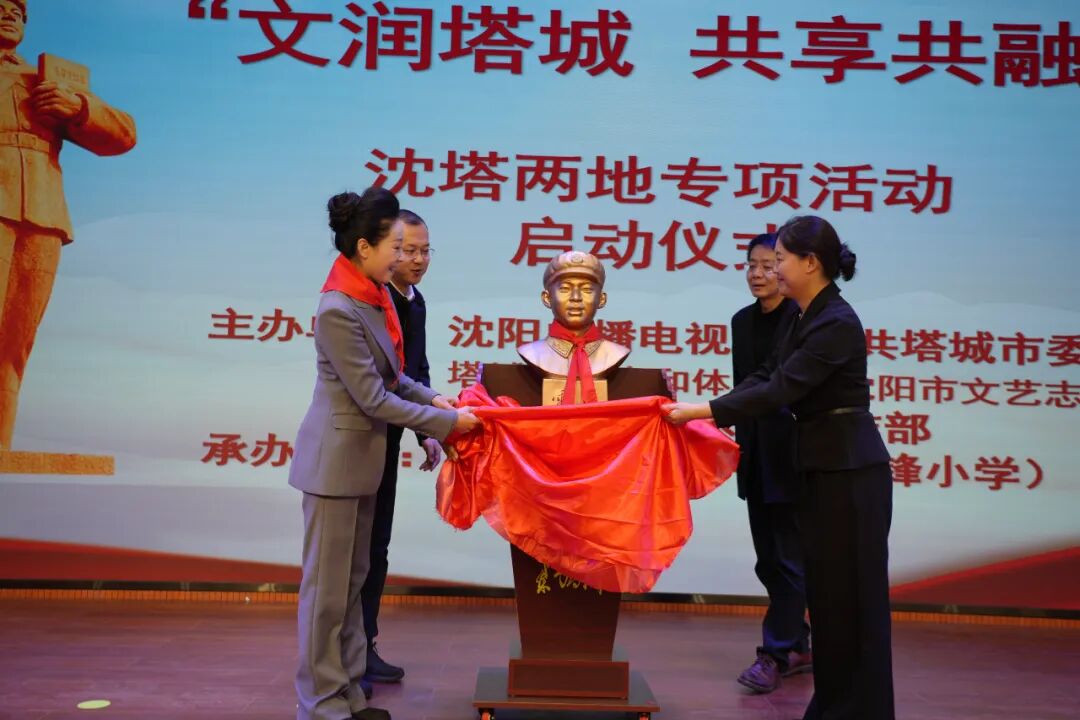 启动仪式上,沈阳广播电视台文化公益专班召集人、节目制作人、首席主持人、沈阳市文艺志愿者协会主席宫正一行,为塔城市第一小学(雷锋小学)捐赠雷锋头像,现场还向学校师生捐赠了500本图书,助力书香校园建设。同时沈塔两地相关领导共同为“礼润塔城 文化共享”主题文化项目工作站揭牌。学生代表宣读了倡议书并带领全体同学宣誓,表达了传承雷锋精神、争做时代新人的决心。通过视频连线,师生们还观看了沈阳市雷锋小学同学们带来的精彩节目,感受跨越千里的文化共鸣。