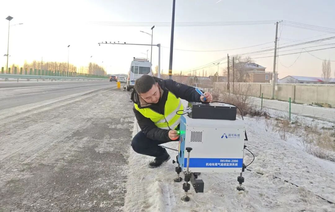 塔城地区生态环境局塔城市分局工作人员使用移动机动车尾气遥感检测系统开展监测。