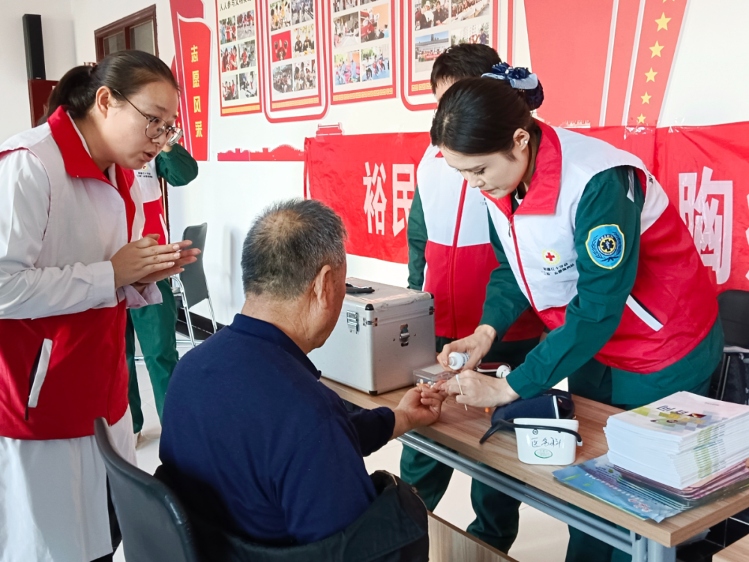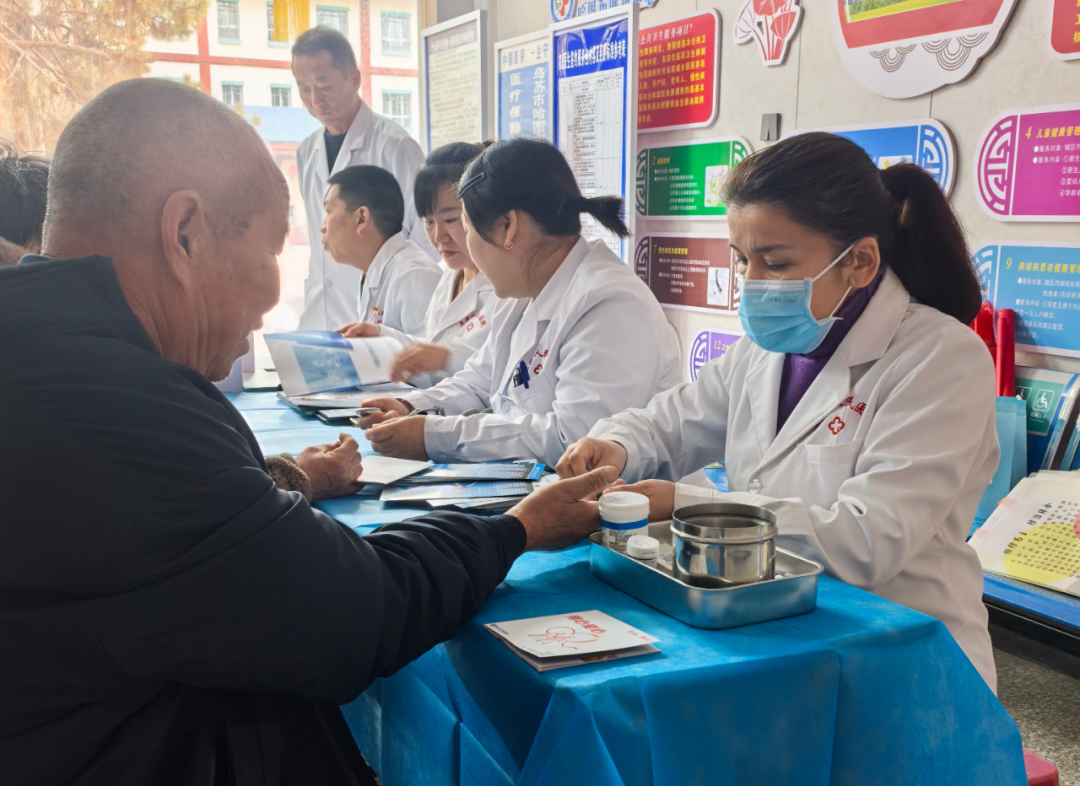 在健康义诊区,裕民县县人民医院、县妇幼、牧业医院的医护人员为居民提供免费血糖检测、血压测量等基础服务。
