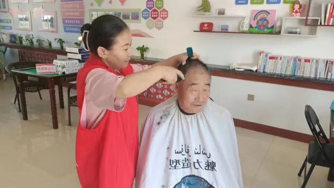 社区工作人员为老人理发。