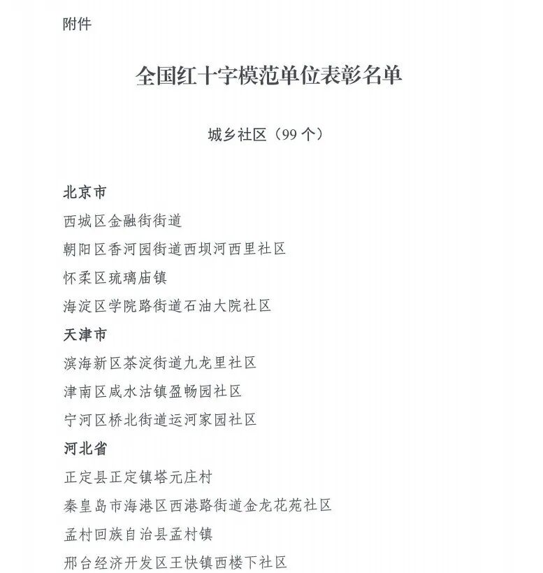 近年来涌现出一批城乡社区、学校、志愿服务组织、机关企事业单位和红十字冠名医疗机构的先进典型。为表彰先进,充分调动社会各界广泛参与和支持红十字事业,形成促进红十字事业发展的合力,中国红十字会总会决定,授予北京市西城区金融街街道等99个城乡社区、99个学校、100个红十字志愿服务组织、52个机关企事业单位和19个冠名红十字医疗机构“全国红十字模范单位”称号。