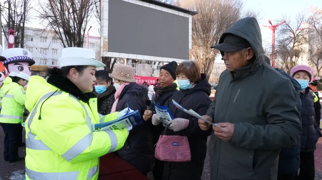 交警向群众发放宣传手册,讲解交通安全注意事项。