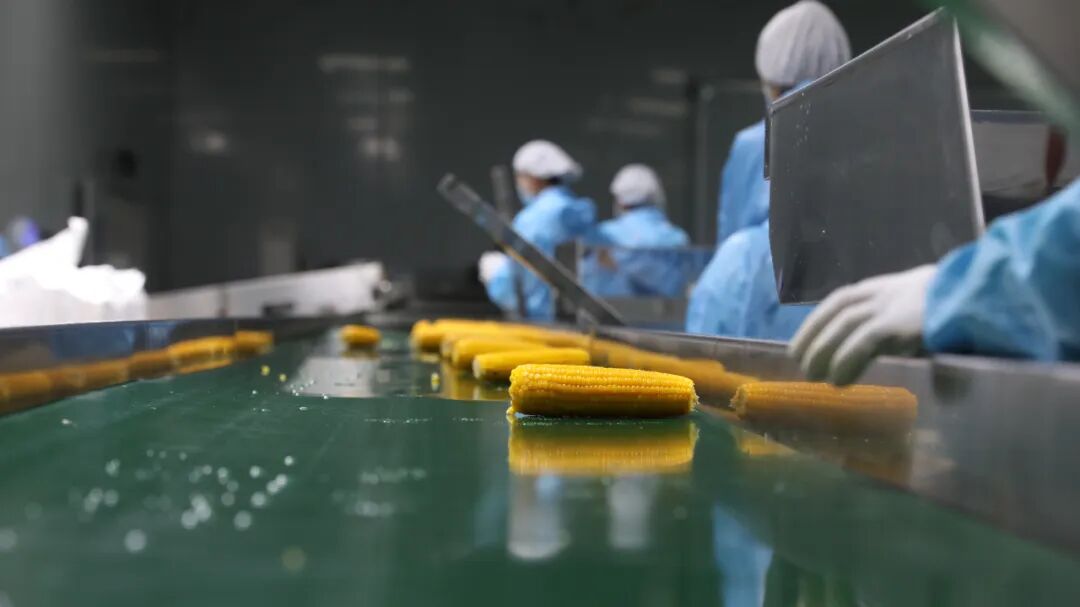 玉米加工厂的工作人员将流水线上的玉米进行修整。