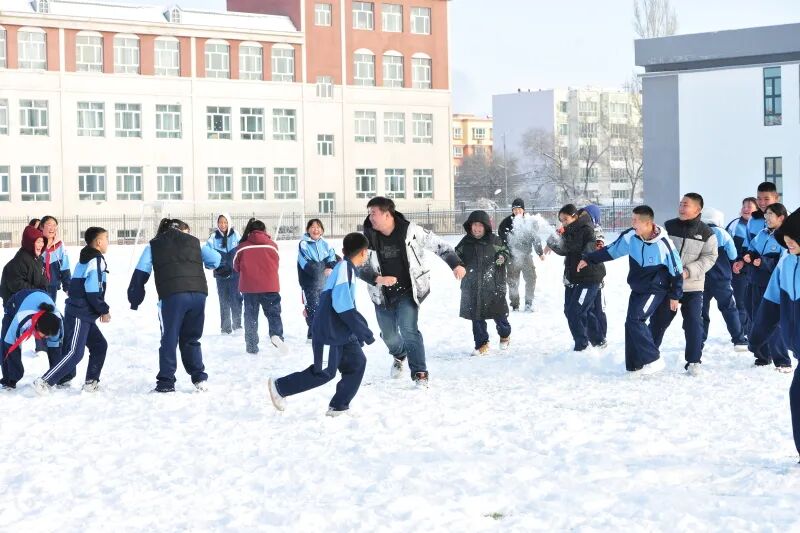 课间,同学和老师一起打雪仗。