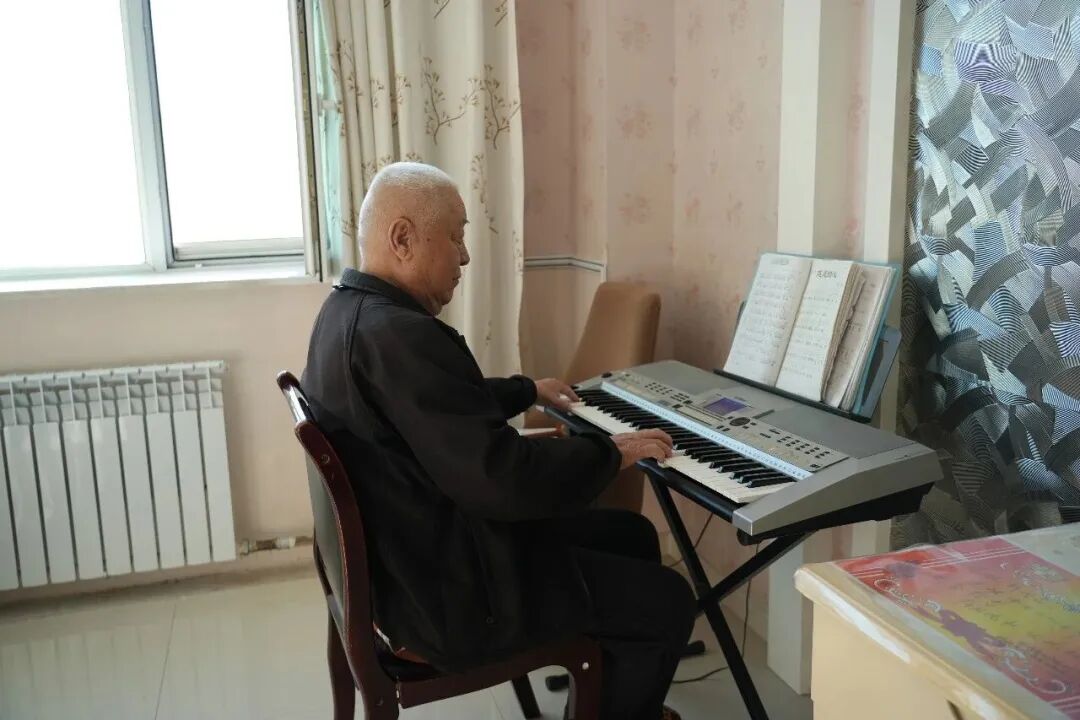 老人在老年公寓居住屋弹琴。