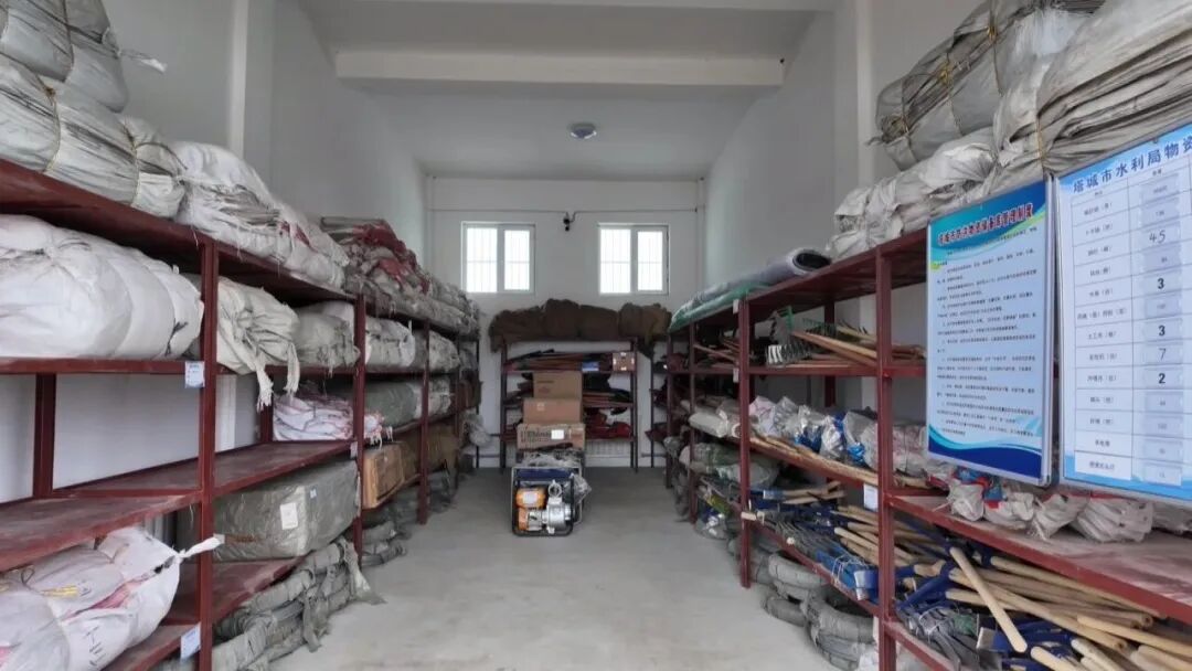 在塔城市水利局物资储备库,各类防汛物资按类别整齐码放、标识清晰,编织袋、铁丝网片、铁锹、救生衣、发电机等应急物资一应俱全,摆放有序、管理规范,确保应急时刻能够快速调运、高效使用。