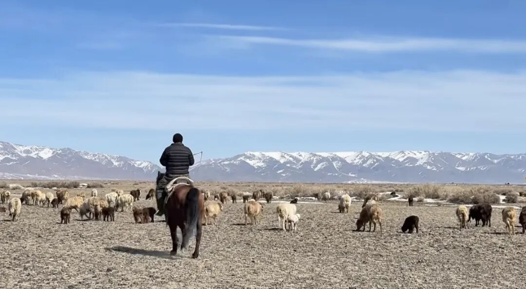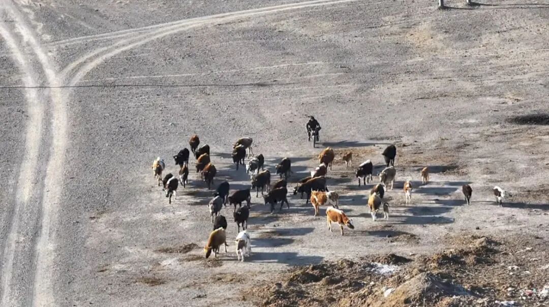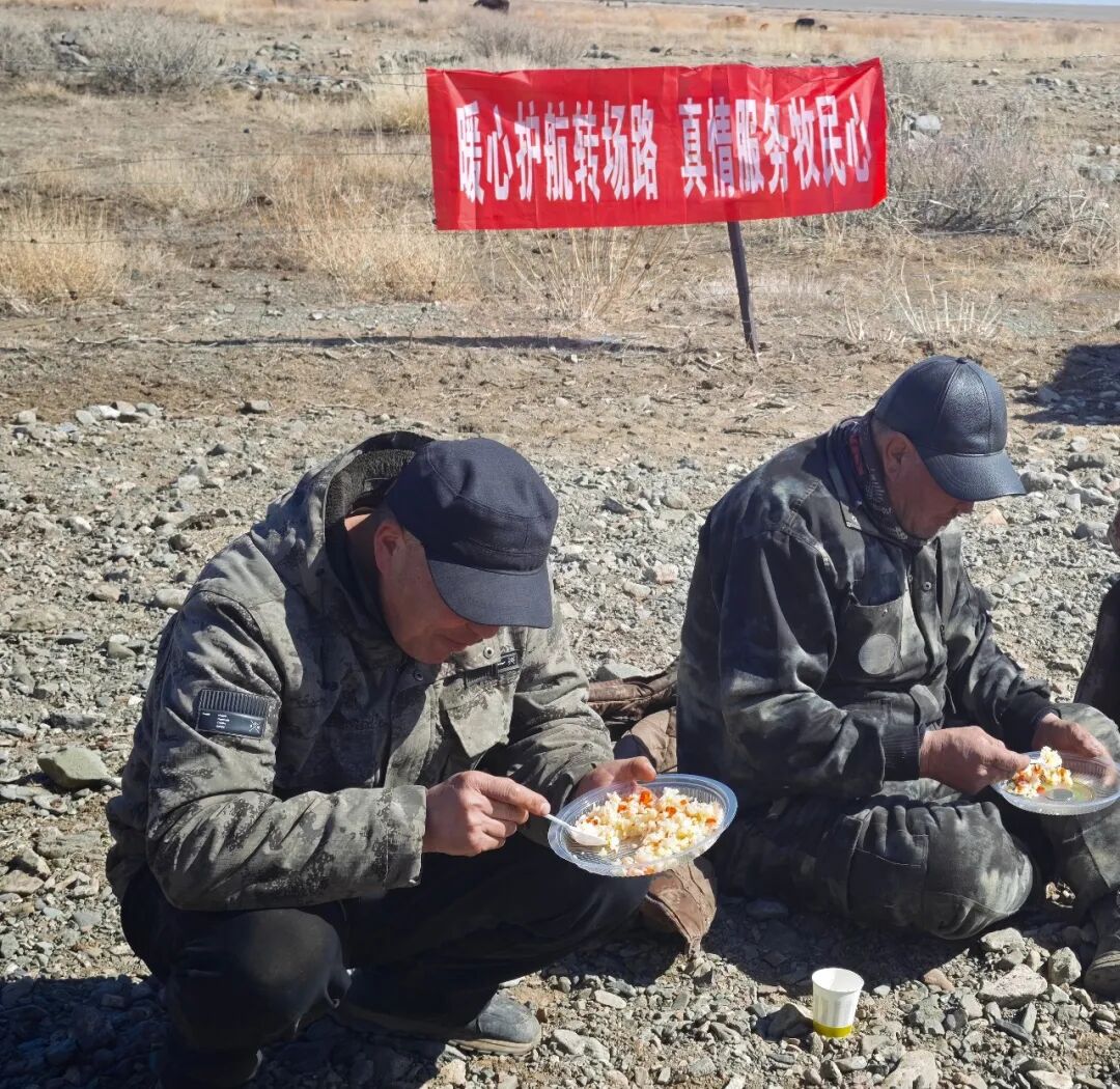 转场当日气温偏低,党员干部与志愿者化身“护航员”,全程协助牧民驱赶牛羊、转运物资,保障牲畜转场安全有序。针对严寒天气,工作人员精心准备了热气腾腾的抓饭、奶茶、馕、矿泉水等暖心物资,送往转场途中10余户牧民手中,叮嘱大家注意保暖、注意安全。