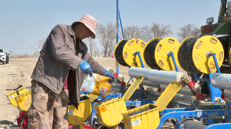 乌苏市古尔图镇桥牛布拉克村农机手正在为播种机添加种子,确保播种作业连续高效推进。