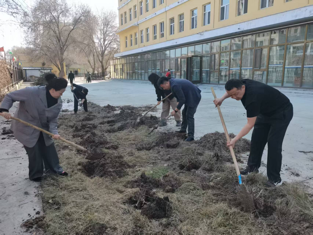 活动现场,干部职工们热情高涨、分工协作,手持铁锹、锄头等工具,有序完成整地、松土、除草、挖坑、栽苗、浇水等工作。庭院、道路、休闲区处处是大家忙碌的身影,现场一派热火朝天的劳动景象。