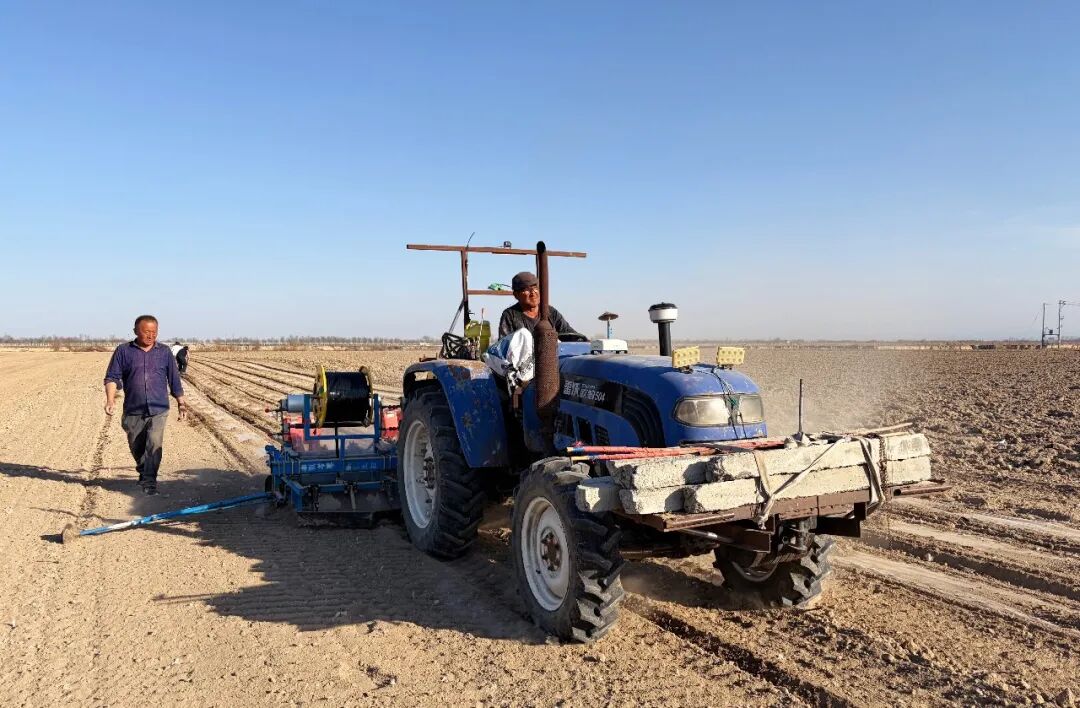 不远处的阔克加依达克村,食葵种植地里,两台点播机轰鸣着作业,下种、撒肥、铺膜,银亮的地膜在田间铺展成整齐的阵列。种植户马继魁脚步不停,穿梭在机器与田垄之间,马继魁说,“乡农技人员天天来田间,从整地到播种都手把手教,有了技术保障,今年收成心里更有底了。”