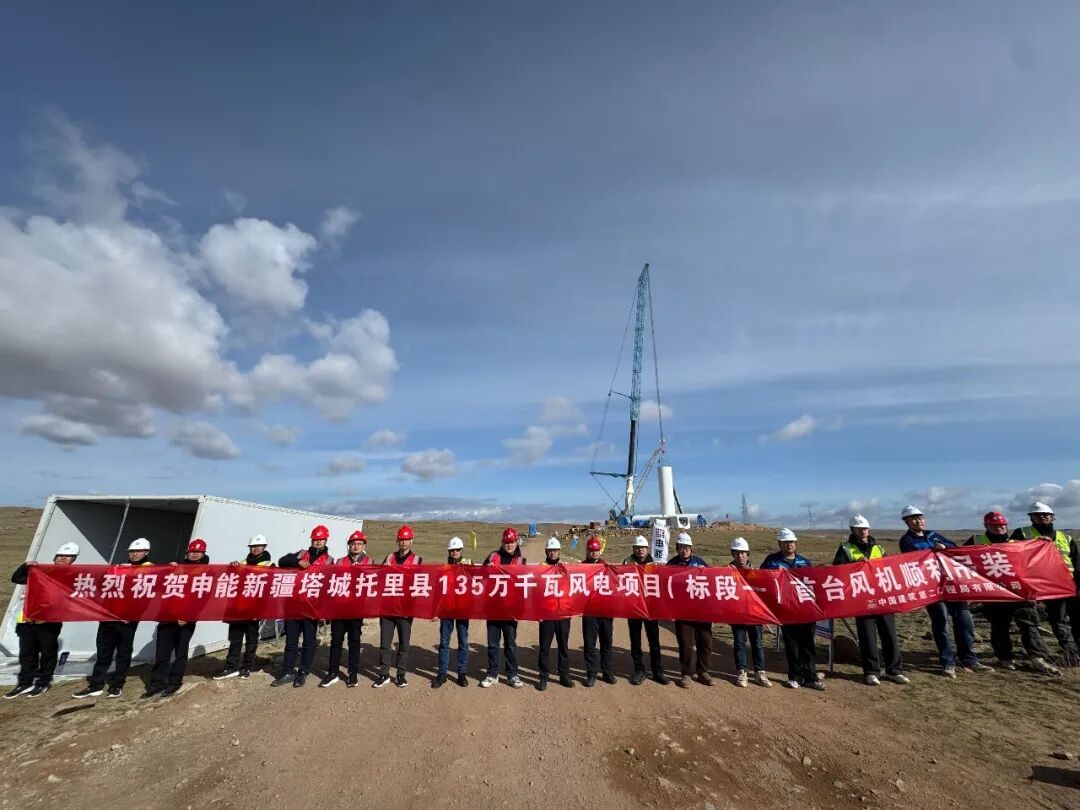 申能新疆塔城托里县135万千瓦风电项目(标段一)首台风机吊装作业顺利完成。