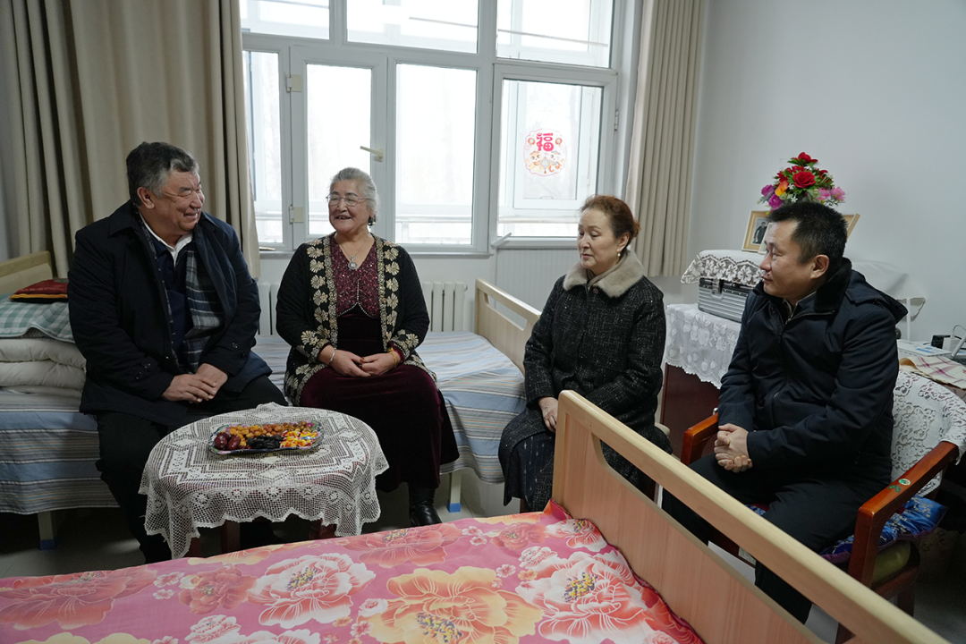 加尔肯·江布尔拜一行看望慰问地区社会福利院老人。塔城地区融媒体中心记者宁杨舒婕摄