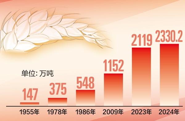 在历史的维度中,腰站子村的发展与新疆重粮抓粮的努力同频共振。自治区成立以来,全区粮食总产稳步提升。1986年总产突破500万吨,2009年突破1000万吨,2023年突破2000万吨。2024年,全区粮食产量2330.2万吨、种植面积4440万亩,分别居全国第13位、17位,分别比“十三五”末上升2位、3位,粮食连续7年实现增产。全年粮食单产524.8公斤/亩,历史上首次跃居全国第一。2022年至2024年,全区粮食净调出量累计达到1417万吨,成为全国7个粮食净调出省份之一,粮食生产实现从人力到机械化再到智能化的演变,完成了从戈壁荒漠到西部粮仓的蝶变。