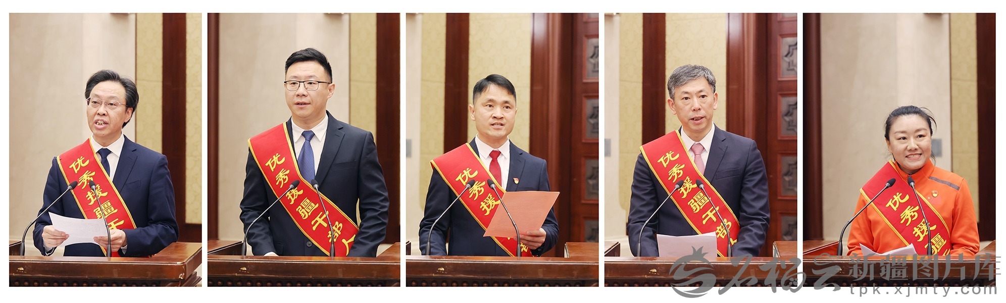 4月27日,在表彰会上,博尔塔拉蒙古自治州党委副书记方向荣、和田地区墨玉县委副书记康家铭、新疆理工学院食品科学与工程学院副院长李佳、喀什地区第二人民医院院长陈尉华、阿勒泰地区文化体育广播电视和旅游局体育科副科长张秋爽(从左至右)代表援疆干部人才发言。天山网-新疆日报记者 崔志坚摄