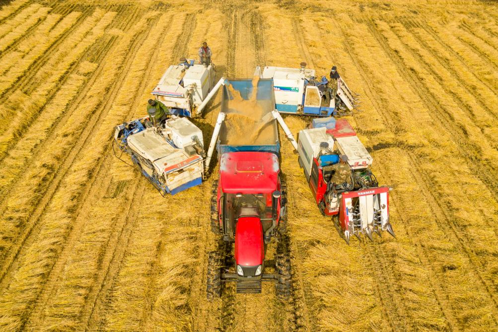 2024年10月13日,在黑龙江省绥化市北林区双河镇,村民驾驶收割机进行卸粮作业(无人机照片)。新华社记者 张涛 摄