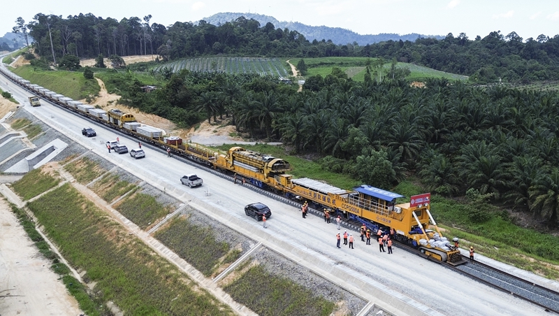 这是2024年5月6日在马来西亚彭亨州航拍的马东铁项目的铺轨现场。新华社记者 程一恒 摄