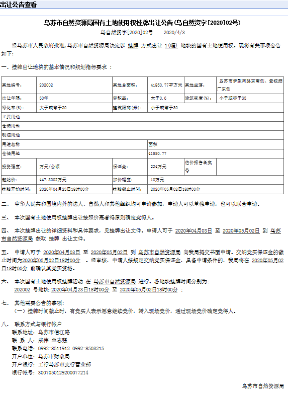 乌苏市自然资源局国有土地使用权挂牌出让公告02号