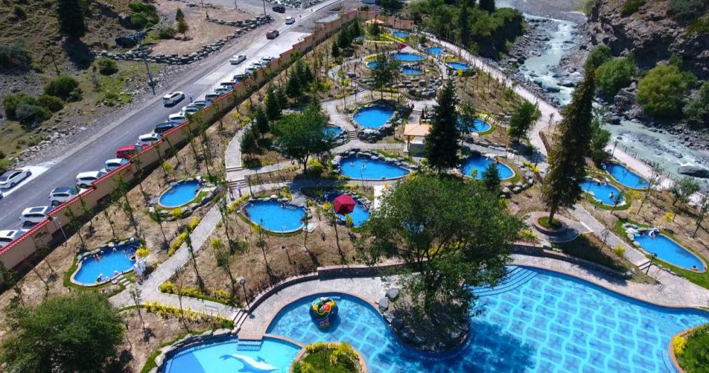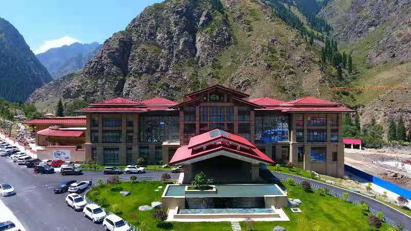 温泉景区位于金沟河谷之中,四面丛峦叠嶂,云杉蓊郁成帐,夏季无酷暑,冬季少严寒,是一处集旅游、疗养、休闲、娱乐为一体的国家AAA级旅游风景区。景区内温泉泉眼众多,泉水由周围的山崖石壁中溢出,无色透明,温热发烫,富碱性,含有碳酸根、硫化氢、钙、镁、锶、钠、砷、铬、铅、铁等30多种对人体有益的矿物质,洗浴后,肌肤爽滑,通体舒畅,面色红润,具有独特的美容效果,被誉为“神水天医”。
