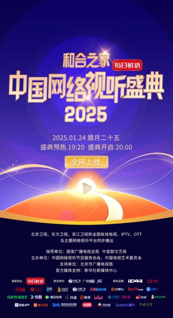 2025中国网络视听盛典将于1月24日20时全网上线,北京卫视、东方卫视、浙江卫视三大卫视和全国有线电视、IPTV、OTT以及主要网络视听平台同步播出。该盛典以“和合之家”为主题,汇集“和韵 和鸣 和创 和睦 和兴”五大篇章,由20多家平台、超过150位演艺人员及多领域名人共同带来46个形式各异、内容丰富的节目。