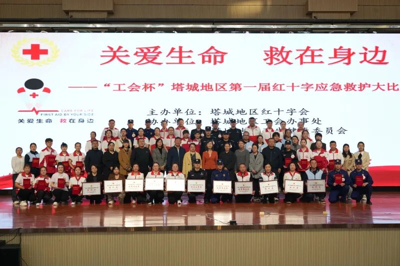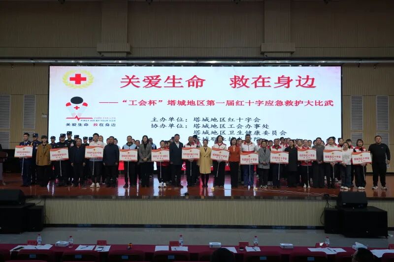 10月14日,塔城地区红十字会联合地区工会办事处、地区卫生健康委员会、塔城职业技术学院,在塔城地区师范学校举办“工会杯”塔城地区第一届红十字应急救护大比武。
