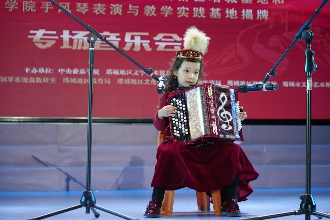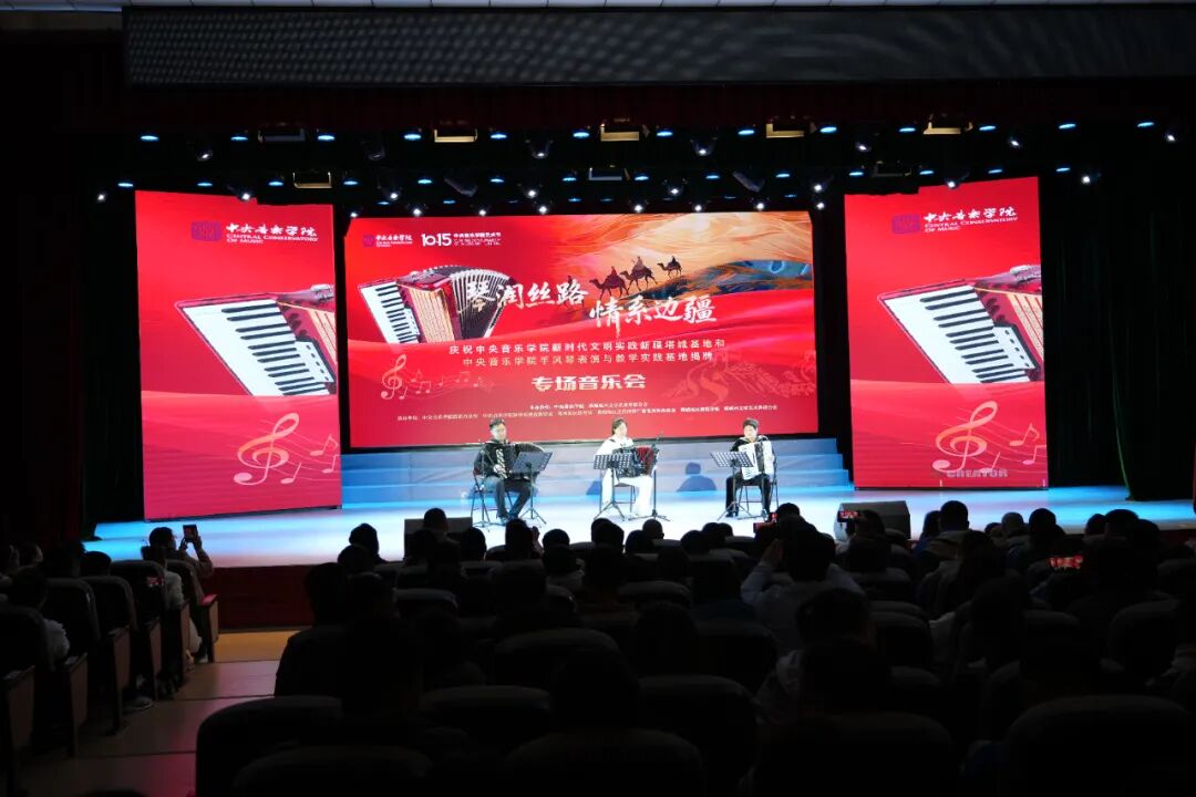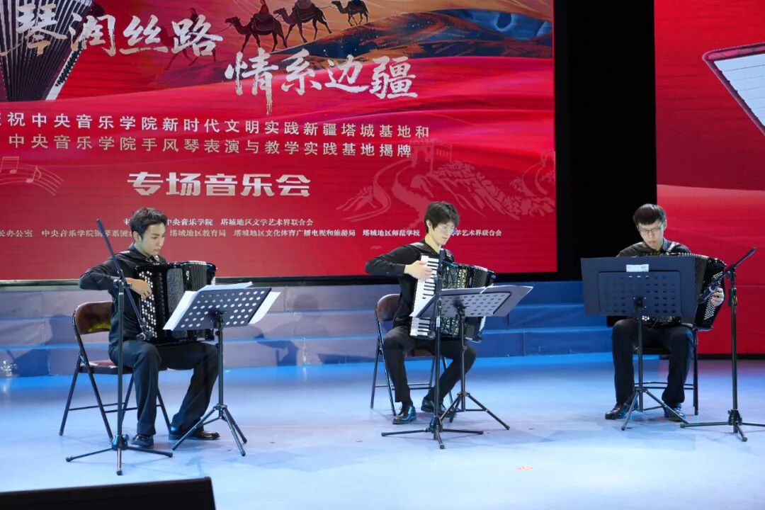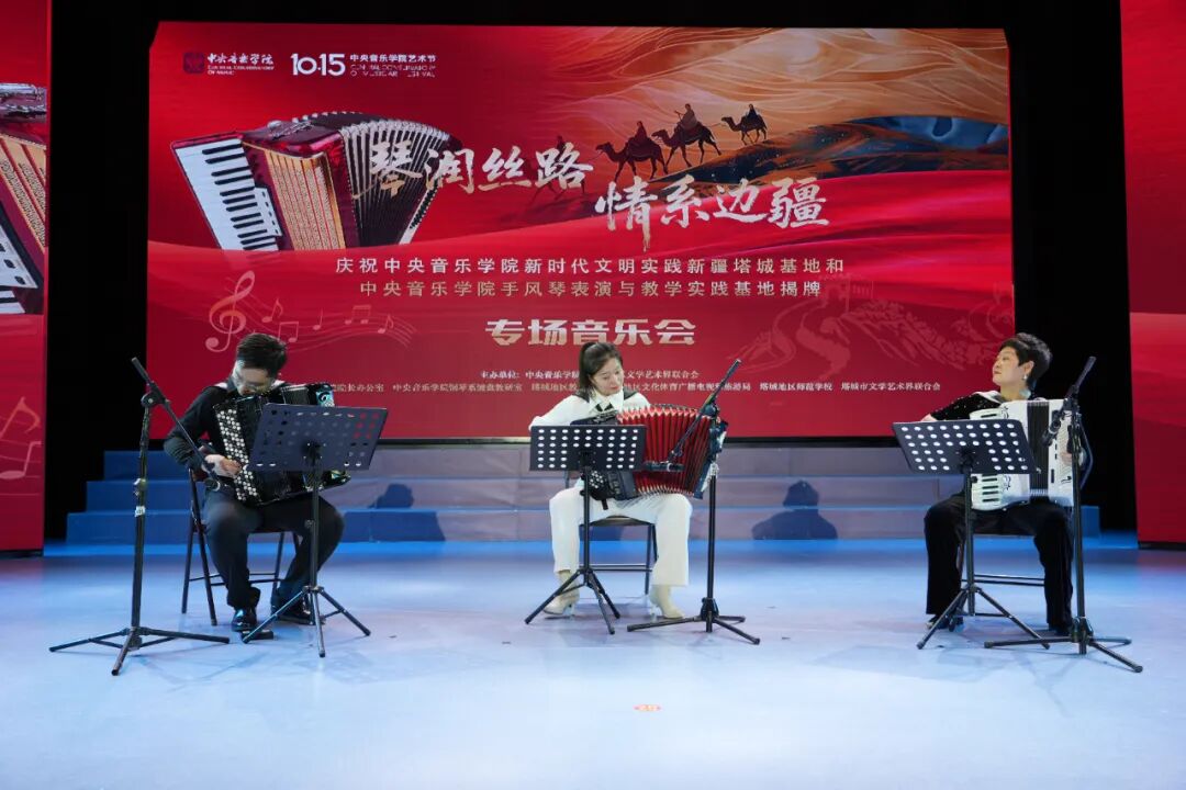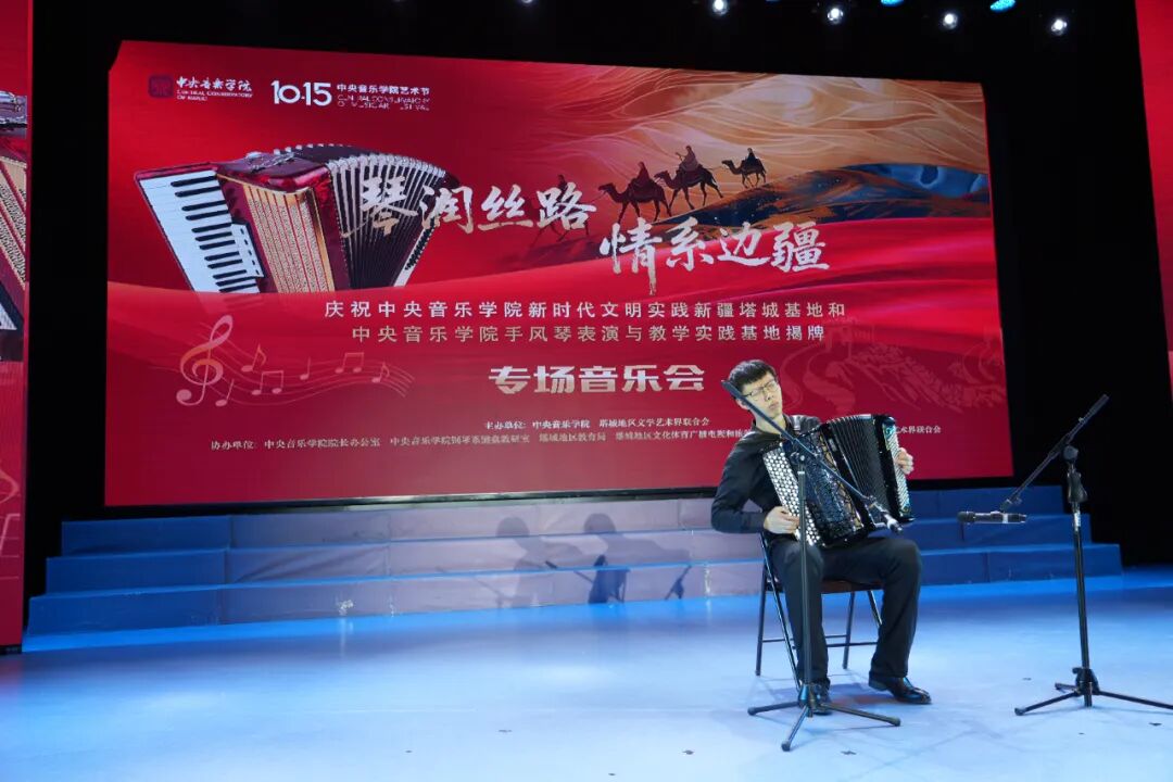 10月19日,中央音乐学院新时代文明实践新疆塔城基地、中央音乐学院手风琴表演与教学实践基地揭牌仪式,在塔城地区师范学校行政楼前举行,10月19日晚,以“琴润丝路 情系边疆”为主题的专场音乐会精彩上演,为塔城各族群众带来了一场高水准的艺术盛宴。
