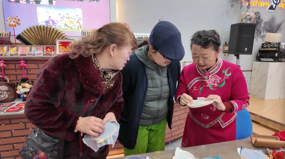 从穿线、起针,到调整针距松紧,再到纹样定位、色彩搭配,春英始终俯下身子,耐心地手把手教学、拿着绣绷亲自示范,只要发现有人针法偏差,便立刻上前细心纠正,把看似高深的非遗技艺拆解成简单易懂的步骤,哪怕是从未拿过绣针的零基础新手,跟着学上一会儿就能轻松上手,越绣越有兴致、越绣越有成就感。